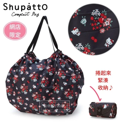 日本直送|Shupatto 折疊購物袋 L 黑底小花便攜折疊購物袋 摺疊購物袋 購物袋 便攜 可折疊