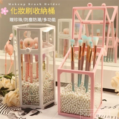 〈台灣公司現貨〉防尘化妆刷收纳桶 化妆刷收纳桶 笔筒 桌面置物 玻璃收纳带珍珠 眼影刷 刷具收納 化妝品收納 收納桶